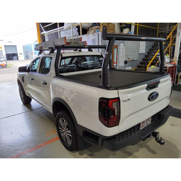 Ford Ranger Wildtrak XL with manual Mountain Top Shutter Pro Textured Black 76mm Trade Racks