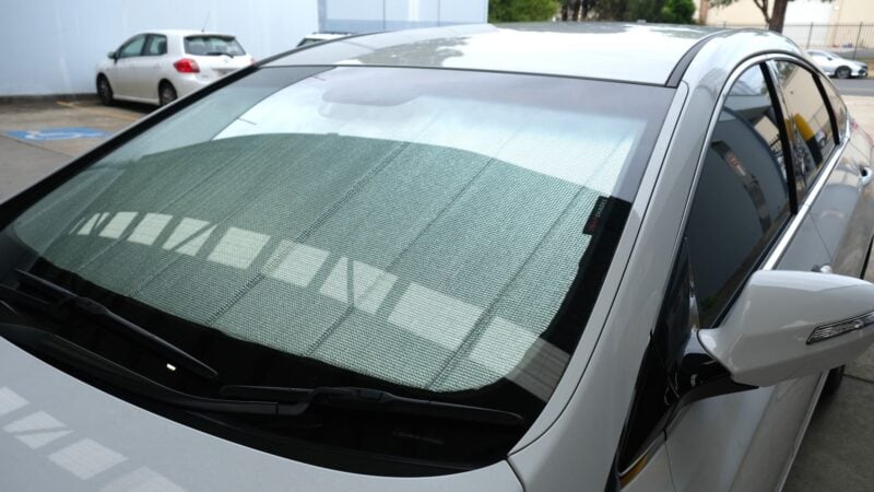 Note: Our custom sun shades block out a significant amount of light and UV rays that enter from the front windscreen, however due to the angle of the front windscreen and additional sensors or different mirror shapes/sizes available for different models, there may be slight gaps around your rear-view mirror or sides to allow the sun shade to fit.