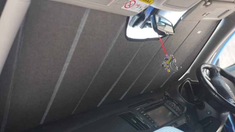 Note: Our custom sun shades block out a significant amount of light and UV rays that enter from the front windscreen, however due to the angle of the front windscreen and additional sensors or different mirror shapes/sizes available for different models, there may be slight gaps around your rear-view mirror or sides to allow the sun shade to fit.