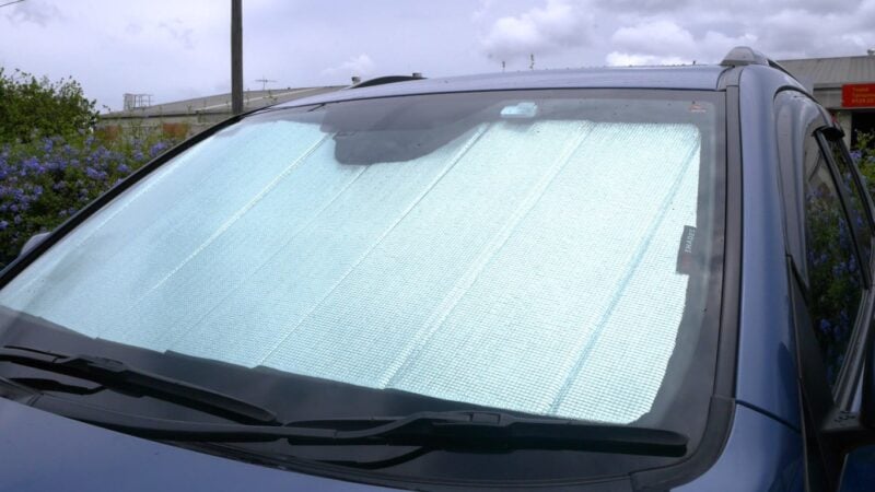 Note: Our custom sun shades block out a significant amount of light and UV rays that enter from the front windscreen, however due to the angle of the front windscreen and additional sensors or different mirror shapes/sizes available for different models, there may be slight gaps around your rear-view mirror or sides to allow the sun shade to fit.