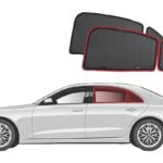 Note: Our custom sun shades block out a significant amount of light and UV rays that enter from the front windscreen, however due to the angle of the front windscreen and additional sensors or different mirror shapes/sizes available for different models, there may be slight gaps around your rear-view mirror or sides to allow the sun shade to fit.