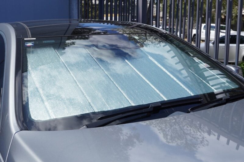 Note: Our custom sun shades block out a significant amount of light and UV rays that enter from the front windscreen, however due to the angle of the front windscreen and additional sensors or different mirror shapes/sizes available for different models, there may be slight gaps around your rear-view mirror or sides to allow the sun shade to fit.