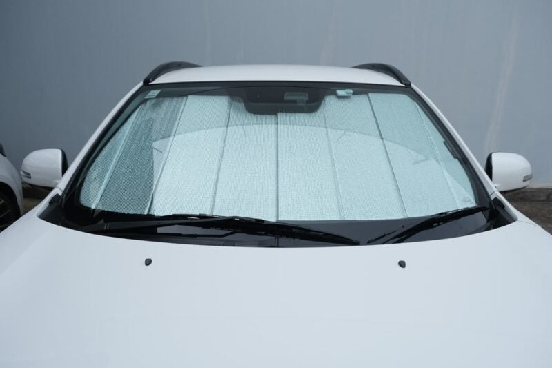 Note: Our custom sun shades block out a significant amount of light and UV rays that enter from the front windscreen, however due to the angle of the front windscreen and additional sensors or different mirror shapes/sizes available for different models, there may be slight gaps around your rear-view mirror or sides to allow the sun shade to fit.