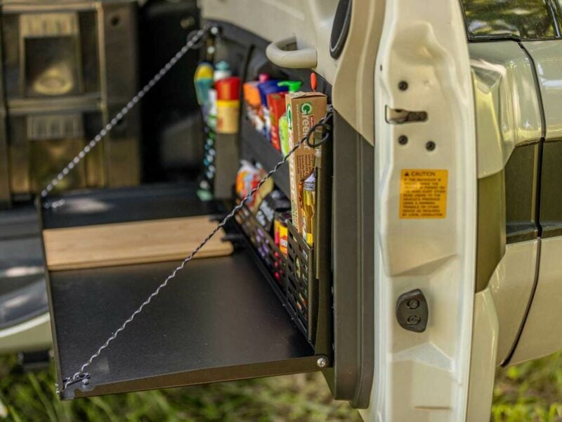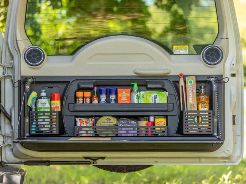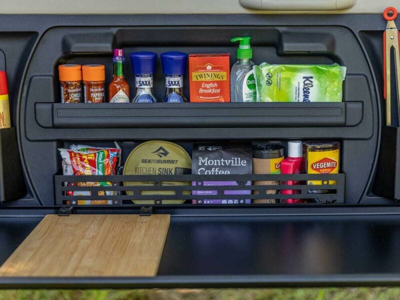 Our Centre Cage creates functional and easy-access storage under the factory trim cover. The addition of Pocket Cages maximises your setup, taking blank recesses on the rear door and turning them into useful spaces. Simply add the table, and you’ve got a kitchen setup that’ll be the envy of the campground.Â