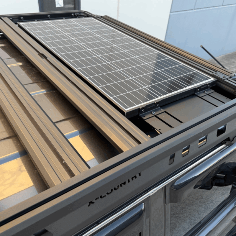The X-Country Recessed Solar Panel kit is the perfect way to mount your solar panel to the top of your Summit platform. With the panel completely recessed below the height of the Summit platform, the rack can still be fully utilised to carry long loads. It is simply installed by removing 2 planks and inserting the bracket kit. Ideal for 100W panels 1010mm x 510mm x 30mm.