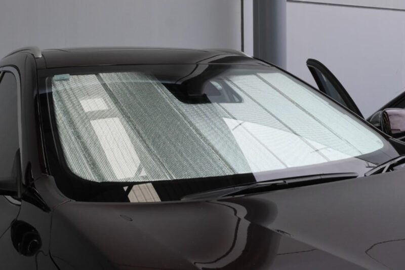 Note: Our custom sun shades block out a significant amount of light and UV rays that enter from the front windscreen, however due to the angle of the front windscreen and additional sensors or different mirror shapes/sizes available for different models, there may be slight gaps around your rear-view mirror or sides to allow the sun shade to fit.