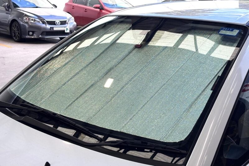 Note: Our custom sun shades block out a significant amount of light and UV rays that enter from the front windscreen, however due to the angle of the front windscreen and additional sensors or different mirror shapes/sizes available for different models, there may be slight gaps around your rear-view mirror or sides to allow the sun shade to fit.