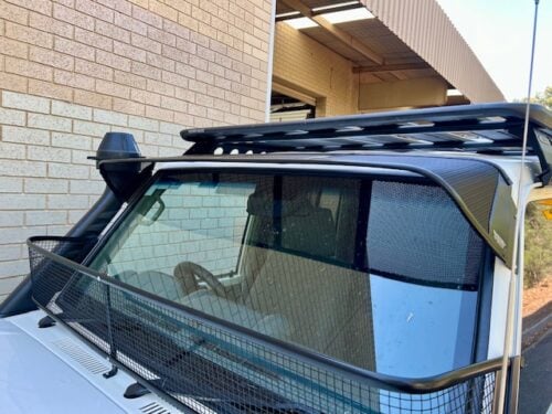 Toyota 70-79 Series Landcruiser (with factory snorkel) Black Windscreen Stone Guard & Mesh Sunvisor Bundle