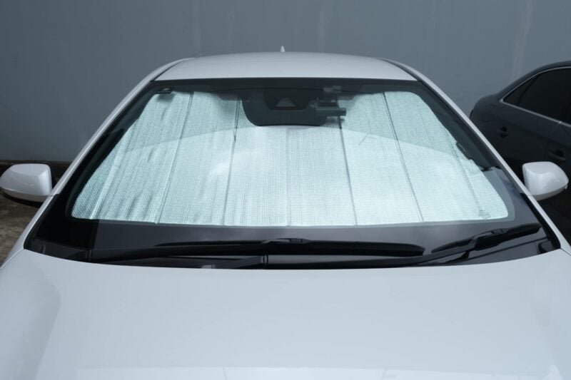 Note: Our custom sun shades block out a significant amount of light and UV rays that enter from the front windscreen, however due to the angle of the front windscreen and additional sensors or different mirror shapes/sizes available for different models, there may be slight gaps around your rear-view mirror or sides to allow the sun shade to fit.