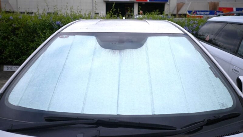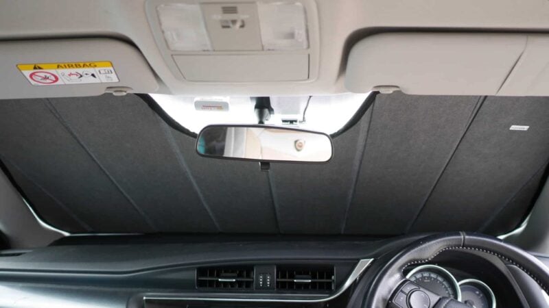 Note: Our custom sun shades block out a significant amount of light and UV rays that enter from the front windscreen, however due to the angle of the front windscreen and additional sensors or different mirror shapes/sizes available for different models, there may be slight gaps around your rear-view mirror or sides to allow the sun shade to fit.